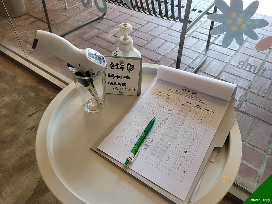 실내 들어가기 전 당연히 방문 기록표를 작성해야 해요.